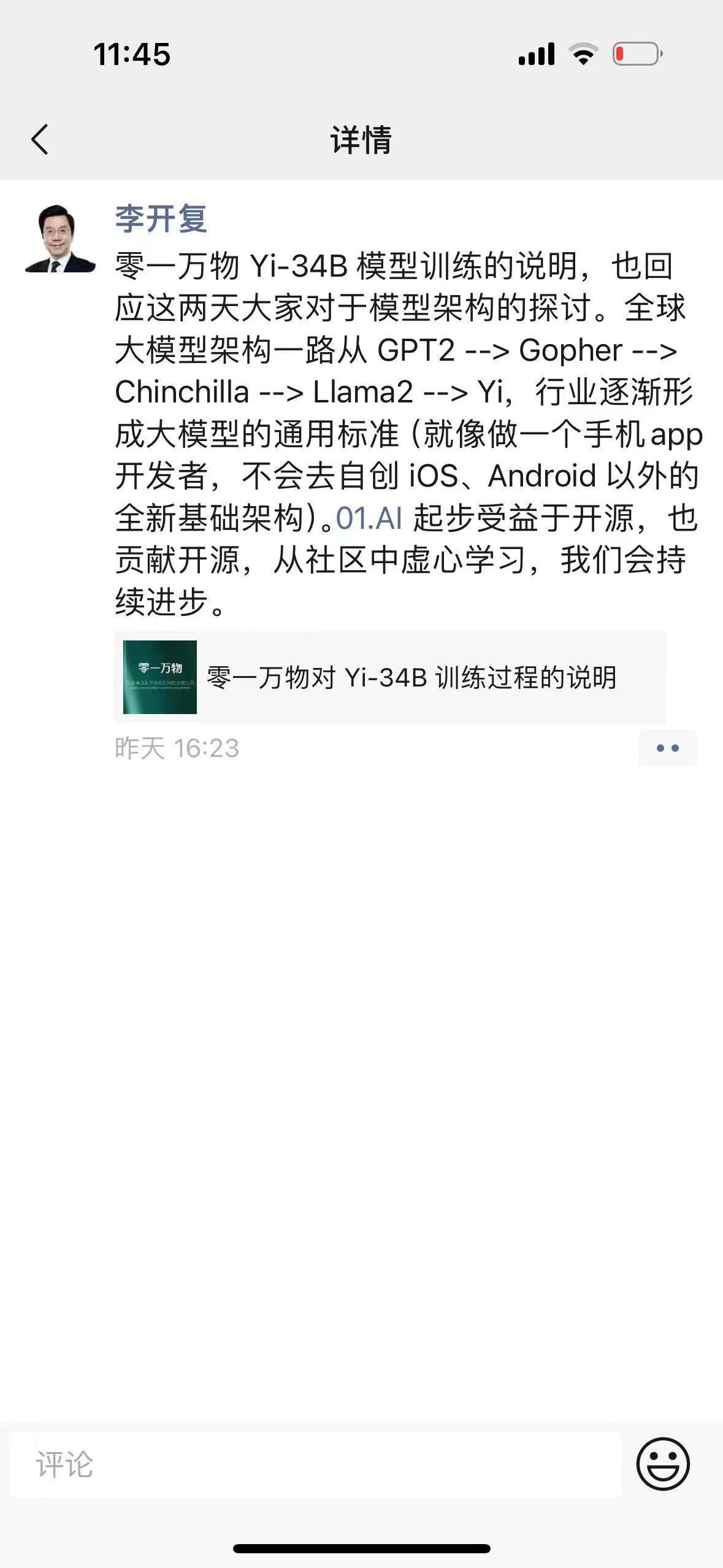 11月15日,创新工厂董事长兼CEO李开复在其微信朋友圈转发了旗下零一万物对于日前“套壳”争议的官方回应,并在配文中写道:“全球大模型架构一路从GPT2-->Gopher-->Chinchilla-->Llama2->Yi,行业逐渐形成大模型的通用标准(就像做一个手机APP开发者,不会去自创iOS、Android 以外的全新基础架构)。01.AI起步受益于开源,也贡献开源,从社区中虚心学习,我们会持续进步。”