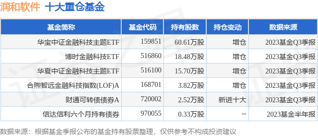 根据2023基金Q3季报公募基金重仓股数据,重仓该股的公募基金共5家,其中持有数量最多的公募基金为华宝中证金融科技主题ETF。华宝中证金融科技主题ETF目前规模为3.05亿元,最新净值1.1587(11月15日),较上一交易日下跌0.09%,近一年上涨11.59%。该公募基金现任基金经理为陈建华。陈建华在任的基金产品包括:华宝中证100ETF联接A,管理时间为2012年12月22日至今,期间收益率为107.55%;华宝化工ETF,管理时间为2021年2月26日至今,期间收益率为-35.02%;华宝有色金属ETF,管理时间为2021年3月12日至今,期间收益率为1.86%。
