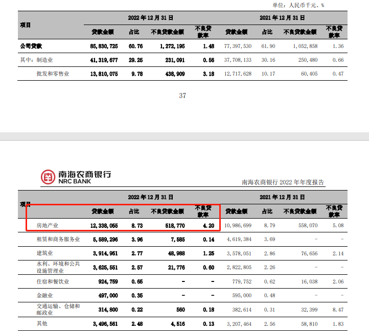 其中,房地产业不良贷款余额为5.19亿元,虽较上年有所减少,但在公司不良贷款总额中的占比为40.78%,占比仍为最大。此外,截至2022年末,房地产业贷款的不良率为4.2%,较上年同期的5.08%有所下降,但其不良率在所有公司贷款投放行业中仍居首。