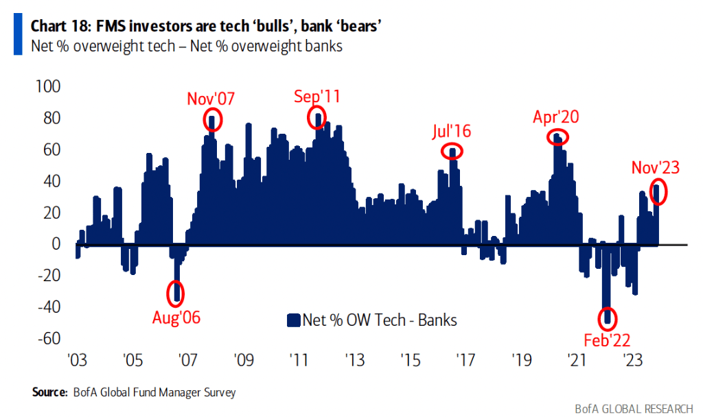 投资者减少了对银行股的配置,净头寸从不足2%减少到不足10%。这表明投资者在配置中更倾向于科技股,而对银行股持谨慎态度。