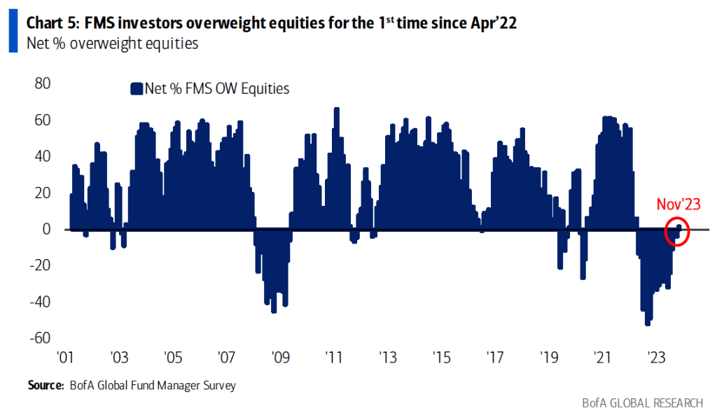 还需要注意的是,本次调查中投资者们对股市的态度也是自2022年4月以来首次翻至超配状态。