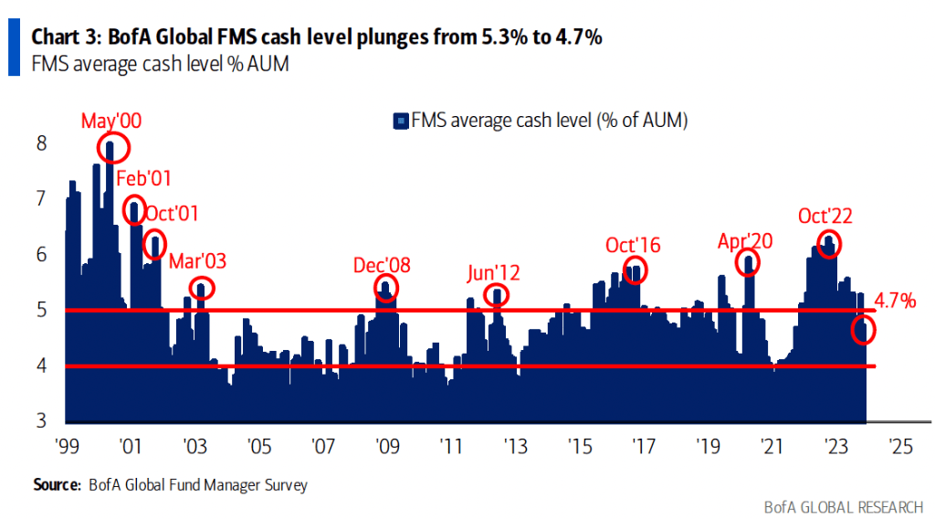 调查显示,投资者将现金比例从5.3%下降到4.7%,降低了55个基点(自2021年11月以来最低),创下了自2023年1月以来的最大月度下降幅度。