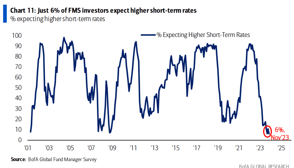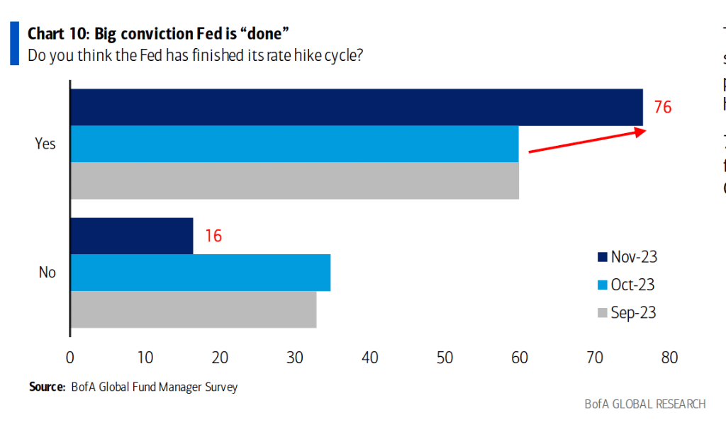 美银的调查也显示,投资者“坚信”美联储已完成加息,自从开始询问这些基金经理“美联储加息何时结束”的问题开始,目前这些受访者对美国利率见顶的信心已经升至最为强烈的状态,76%的投资者相信美联储已完成加息,高于10月份的60%。