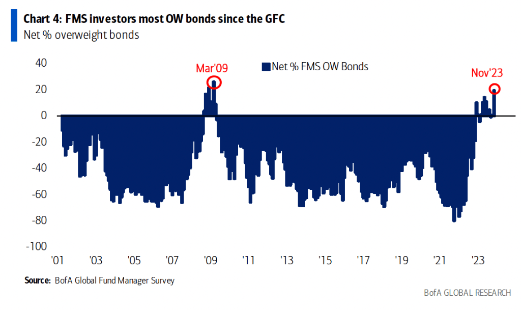 与此同时,本次月度调查最重要的变化便是投资者大举买入债券,持有的债券超配头寸为2009年以来最高,Hartnett解读称这是因为投资者预期通胀和债券收益率将在2024年同步下滑。