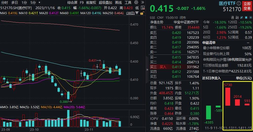 ETF方面,反映医疗板块整体表现的医疗ETF(512170)低开后全天低位震荡,场内价格收跌1.66%,连续失守5日、10日及半年线。全天成交3.85亿元,较昨日略有放量。