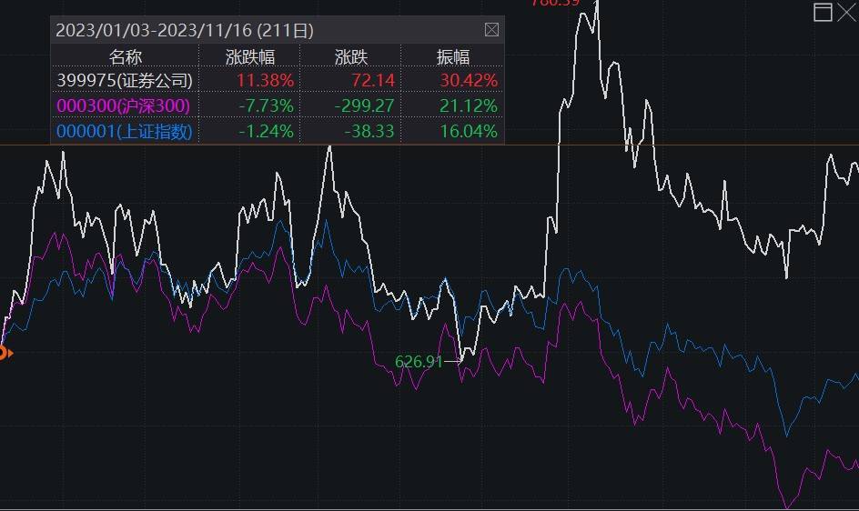 行至年末,回顾年内券商板块表现,截至11月16日,中证全指证券公司指数较年初上涨11.38%,跟踪指数的券商ETF(512000)场内价格累涨超12%。同期沪深300指数下跌7.73%,板块跑赢大盘19pct,表现亮眼。