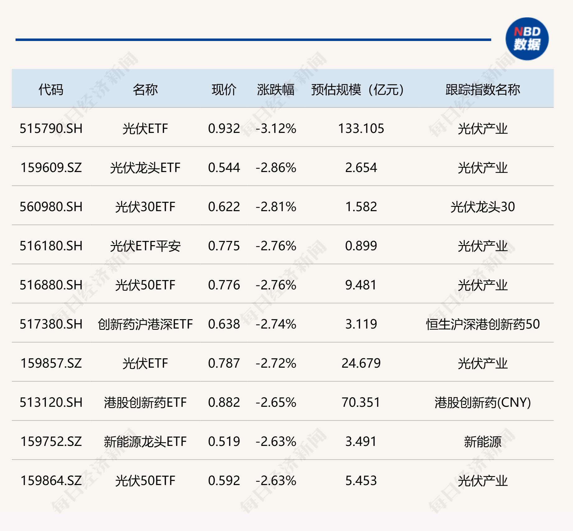 下跌方面,光伏、创新药相关ETF跌超2%。