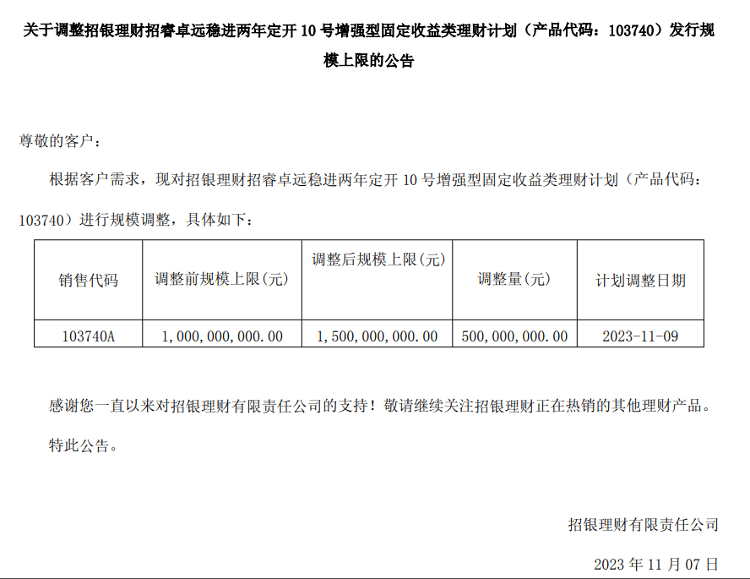 11月2日,招银理财表示,将招睿月添利(平衡)2号固定收益类理财计划的发行规模上限由133亿元调整为138亿元。11月7日,招银理财对招睿卓远稳进两年定开10号增强型固定收益类理财计划的发行规模上限由10亿元上调为15亿元。