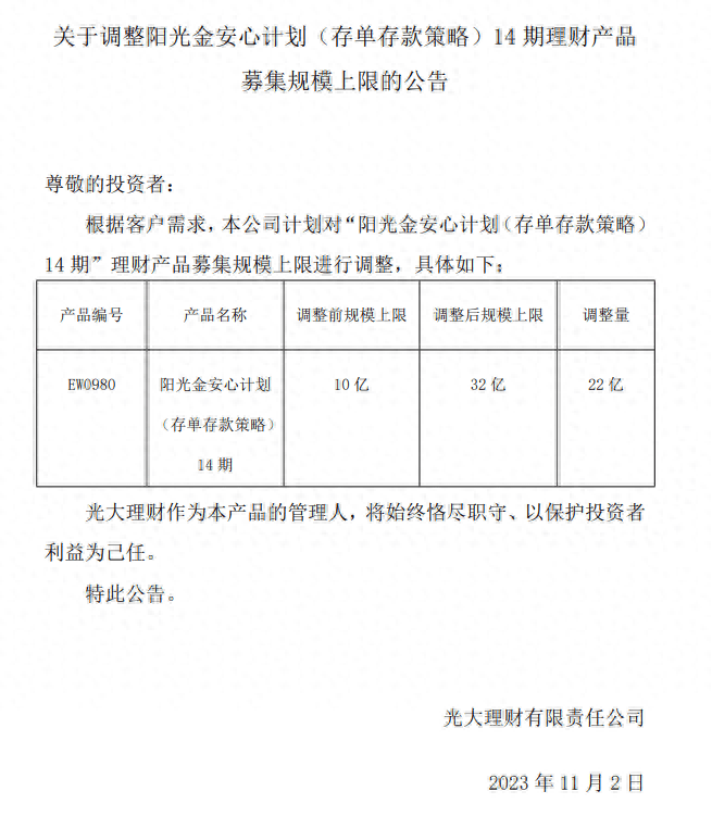 11月2日,光大理财发布公告称,阳光金安心计划(存单存款策略)14期理财产品募集规模上限由10亿元调整为32亿元。
