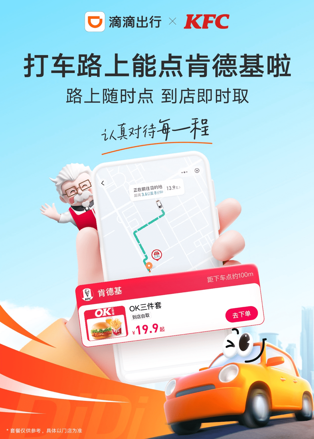 “打车途中快捷点餐”服务可以帮助用户高效利用乘车时间,简化“打车+点餐”的操作流程。滴滴与肯德基的合作,是基于出行对用户体验和服务做的全新探索和尝试,更契合通勤出行场景和白领人群需求。