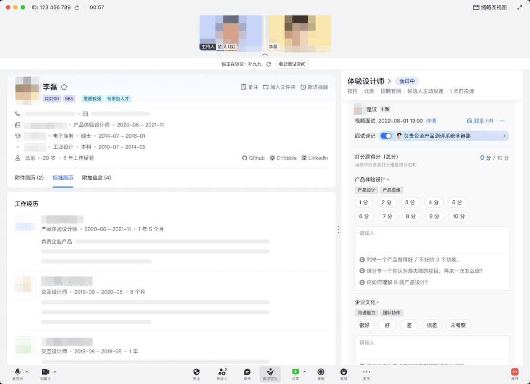 应聘岗位、学历程度、专业背景、工作经历,都可以看得一清二楚。一边看,一边提出针对性的问题。现在,视频效果这么好。我们已经有90%的面试,都是通过视频在线完成的。