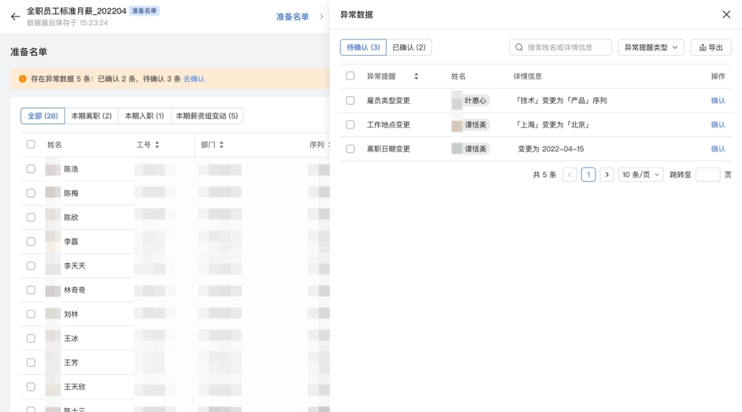 你看,这么多的数字,要是一条一条地通过计算、核验、审批,那要等到猴年马月了。我们就用通过自动的计算,确保“计算”的过程能够快速地完成。通过异常数据推送,确保“核验”和“审批”的过程能够精准地实现。比如,叶慧心已经从技术岗转去了产品岗,谭恬美已经离职,就导致了异常数据。这些少数的、异常的数值,就需要重新确认。