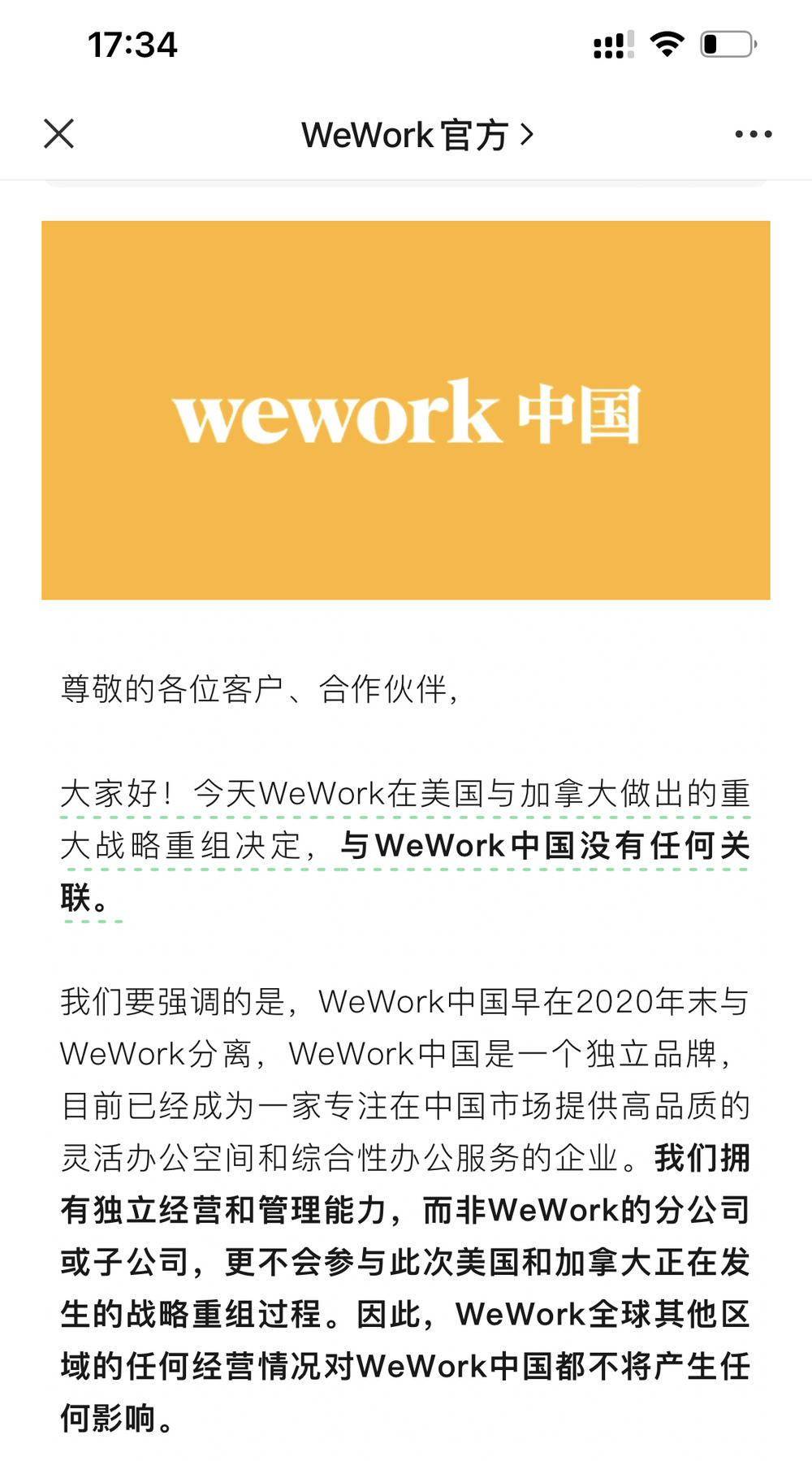 首先,出人意料的是,WeWork破产并未影响到WeWork中国。11月7日,WeWork在微信公众号发文称,WeWork在美国与加拿大做出的重大战略重组决定,与WeWork中国没有任何关联。