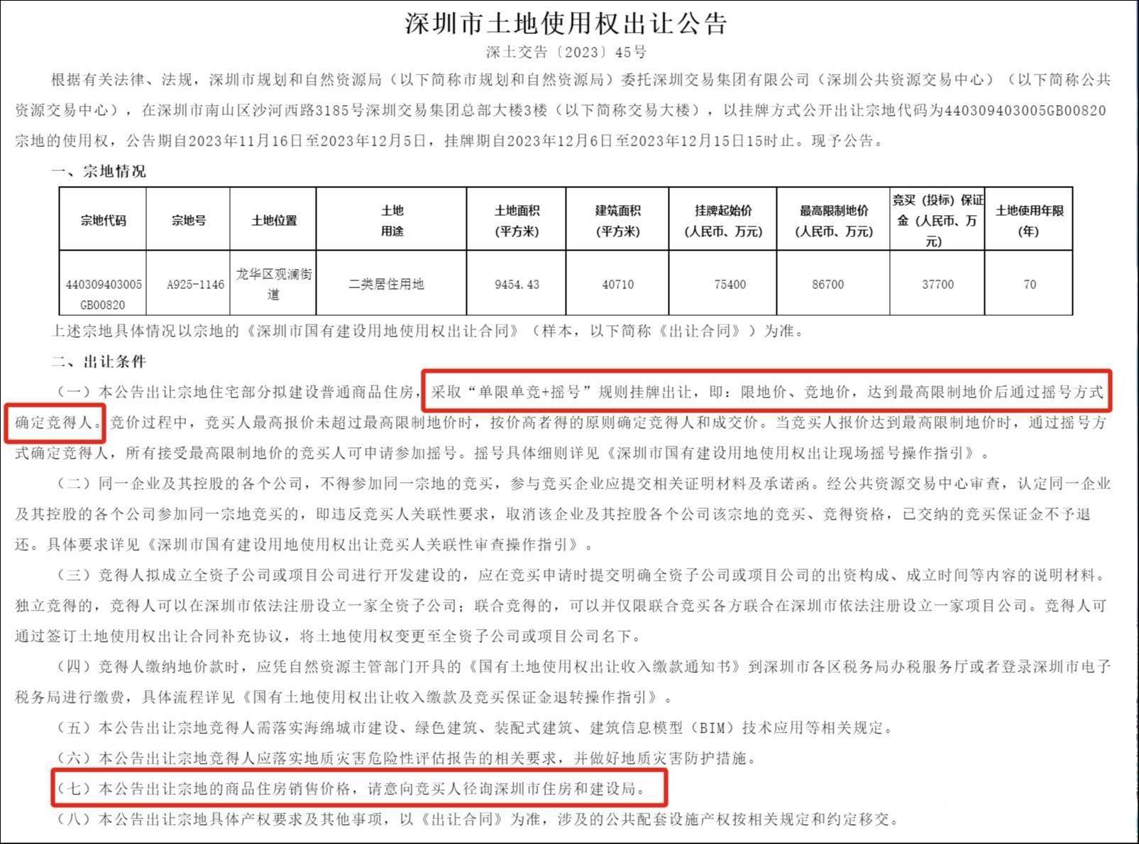 其中,位于龙华区观澜街道的A925-1146宗地(以下简称“龙华地块”)占地面积约9454.43平方米,建筑面积约4.07万平方米,挂牌起始价约7.54亿元,最高限制地价约8.67亿元。