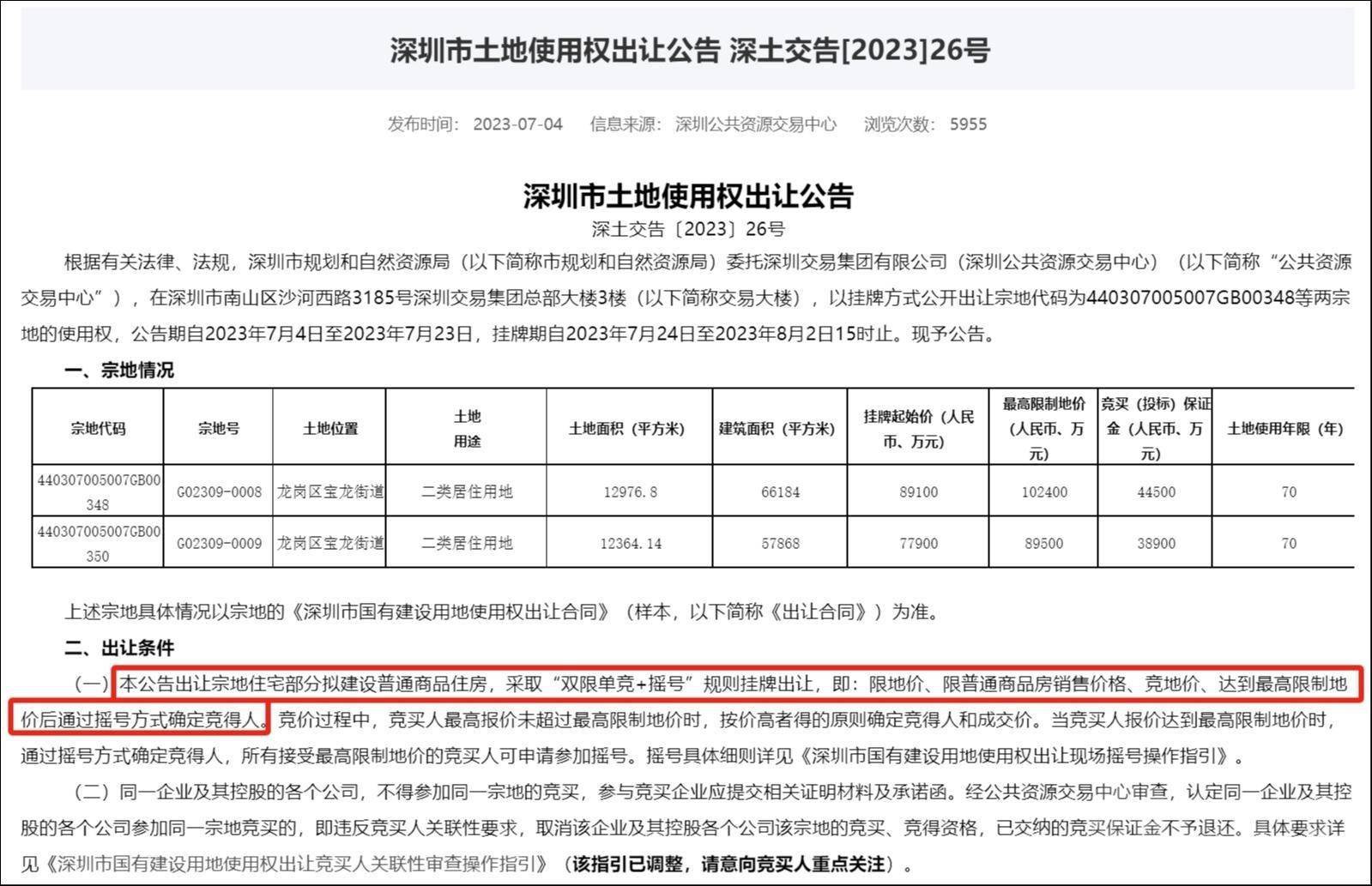 同为7月份,位于龙岗区宝龙街道的两宗居住用地(宗地编号:G02309-0008/G02309-0009)则采取“双限单竞+摇号”规则挂牌出让,即:限地价、限普通商品房销售价格、竞地价、达到最高限制地价后通过摇号方式确定竞得人。对于早前规定的“竞全年期自持的租赁住房建筑面积”、“竞企业自持的保障性租赁住房建筑面积”等均不再作要求。(本文首发于钛媒体 APP,作者|陈伟纳)