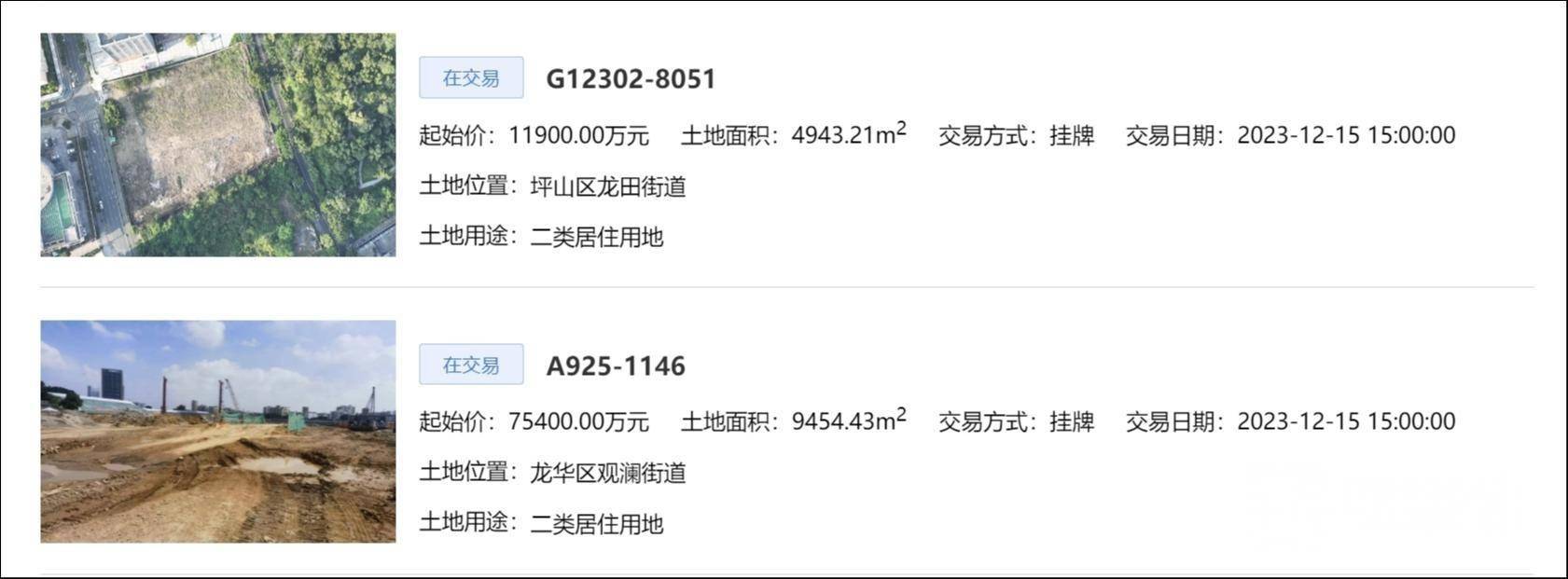 11月16日上午,深圳公共资源交易公共服务平台挂出两宗二类居住用地,分别位于龙华区观澜街道、坪山区龙田街道,挂牌期自2023年12月6日至2023年12月15日15时止。