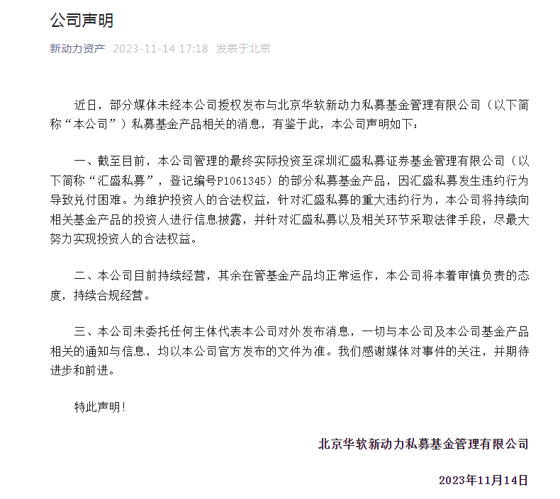 11月14日,红星资本局曾报道,针对“杭州某量化私募跑路,知名百亿私募FOF华软新动力踩雷”的传言,华软新动力发布声明称,截至目前,该公司管理的最终实际投资至深圳汇盛私募证券基金管理有限公司(下称“深圳汇盛”,登记编号P1061345)的部分私募基金产品,因深圳汇盛发生违约行为导致兑付困难。