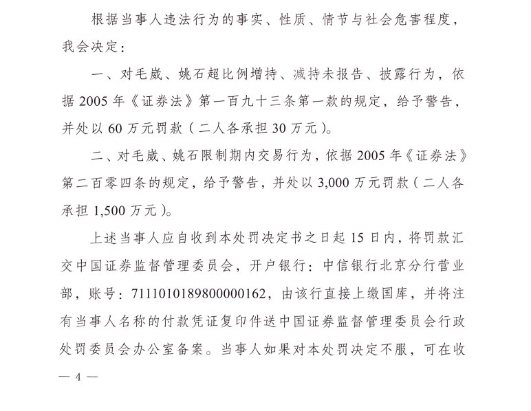 证监会决定,对毛威、姚石限制期内交易行为,依据2005年《证券法》第二百零四条的规定,给予警告,并处以3000万元罚款(二人各承担1500万元)。
