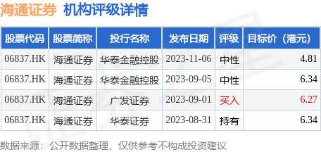 截至2023年11月16日收盘,海通证券(06837.HK)报收于4.64港元,下跌0.64%,换手率0.12%,成交量408.5万股,成交额1894.27万港元。投行对该股的评级以中性为主,近90天内共有2家投行给出中性评级,近90天的目标均价为5.94港元。华泰金融控股最新一份研报给予海通证券中性评级,目标价4.81港元。