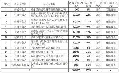 9、股权结构:执行事务合伙人合肥瑞丞私募基金管理有限公司出资500万元,持有瑞丞战新基金0.2375%的股权;有限合伙人芜湖奇瑞资本管理有限公司出资50,000万元,持有瑞丞战新基金23.7530%的股权;有限合伙人芜湖产业投资基金有限公司出资75,000万元,持有瑞丞战新基金35.6295%的股权;有限合伙人芜湖高新产业发展基金有限公司出资50,000万元,持有瑞丞战新基金23.7530%的股权;有限合伙人芜湖银湖实业有限公司出资25,000万元,持有瑞丞战新基金11.8765%的股权;有限合伙人芜湖三山泓远投资引导基金管理有限公司出资10,000万元,持有瑞丞战新基金4.7506%的股权。