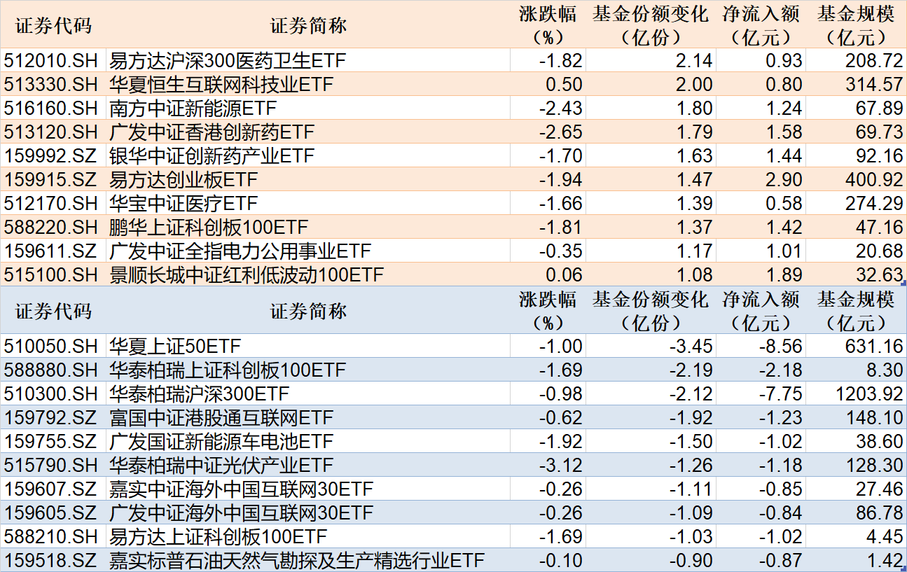 此外,华夏上证50ETF的涨跌幅为-1.00%,基金份额减少了3.45亿份,净流出额为8.56亿元。华泰柏瑞上证科创板100ETF的涨跌幅为-1.69%,基金份额减少了2.19亿份,净流出额为2.18亿元。华泰柏瑞沪深300ETF的涨跌幅为-0.98%,基金份额减少了2.12亿份,净流出额为7.75亿元。