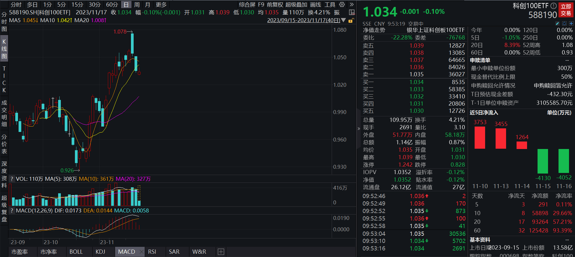 截至2023年11月17日9:53,科创100ETF(588190)早盘回调0.10%,报1.034元,成交额达1.14亿元,市场资金持续关注。