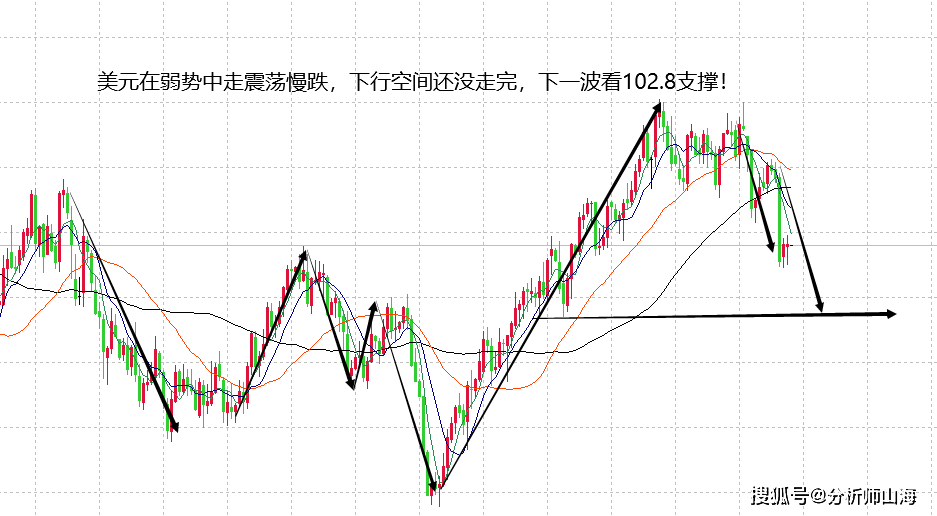 美元周四在失业金数据的影响下走震荡下跌,最低在103.8,虽然力度不大,但保持了基本弱势的状态,符合预期,目前收盘再次在104.2附近,那么,维持前期的看法不变,这波美元在趋势的作用之下,可以继续看跌至102.8低点,因此,近期美元要么是弱势震荡,要么是等待大跌空间。本周尾盘也就没有什么好讲的,在空头趋势下,等待美元的下跌即可。