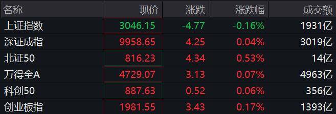 【沪指半日跌0.16%】上证指数跌0.16%,报3046.15点;深证成指涨0.04%,报9958.65点;创业板指涨0.17%,报1981.55点。盘面上看,PET铜箔、金属新材料、电子化学品等板块领涨两市。华为昇腾、房地产服务、华为欧拉等板块跌幅居前。(中新经纬APP)