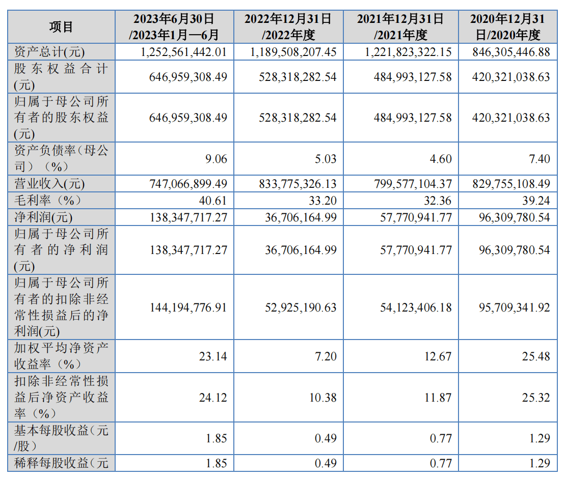 2020年、2021年、2022年及2023年上半年,九州风神营业收入分别为8.3亿元、8亿元、8.34亿元、7.47亿元;归属于母公司所有者的净利润分别为9630.98万元、5777.09万元、3670.62万元、1.38亿元。
