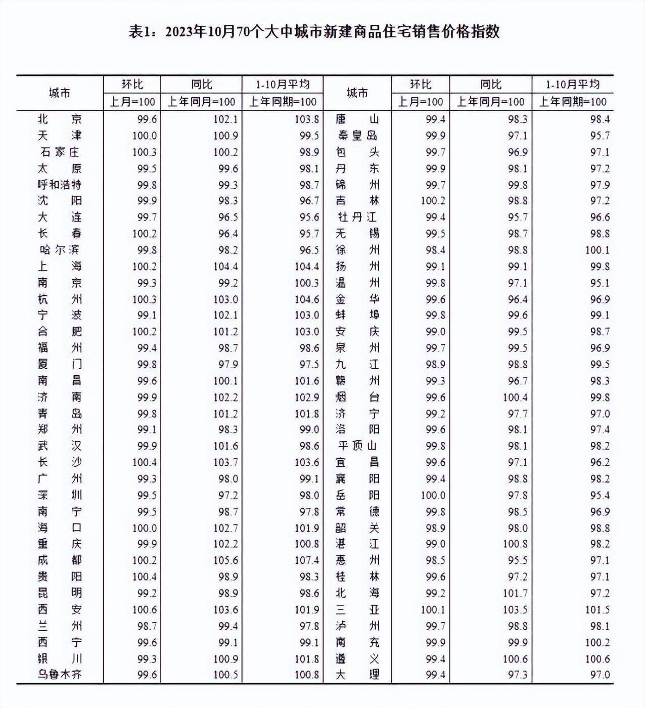2023年10月70个大中城市新建商品住宅销售价格指数。 截图自国家统计局官网