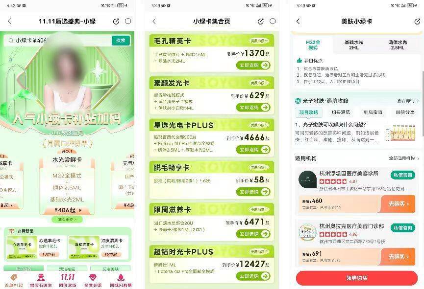 低价尝鲜≤500元:肌痘护理卡(489元)、水光尝鲜卡(438元)、元气V脸卡(556元) 中档保养≤3000元:熊猫眼综卡(1524元)、青春密码卡(2218元) 高端美护>5000元:眼周滋养卡(6471元)、超钻时光卡PLUS(12427元)