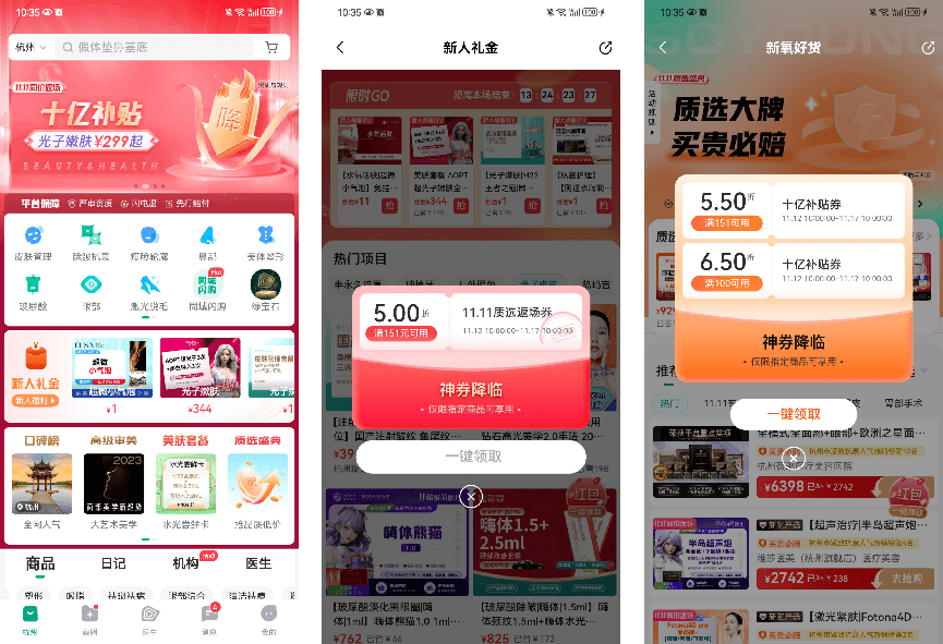 在官方APP的首页,可以看到各类优惠与补贴,其中新用户注册更是可以领取一笔[新人礼金],以此刺激用户产生第一笔消费。