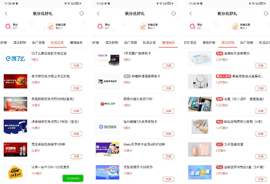 氧分可以在“氧分商城”兑换商品,分成六个不同的区域,具体如下: