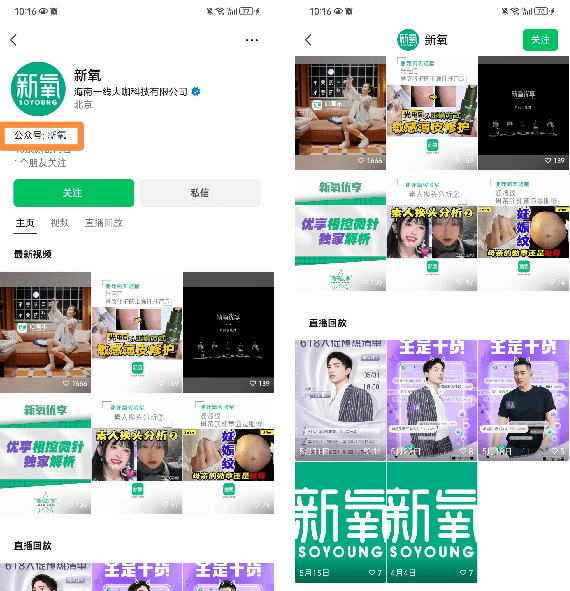 视频号「新氧」主要内容以品牌宣传、产品介绍为主。主页设置了公众号引流的触点,用户点击链接可以跳转公众号进入私域。