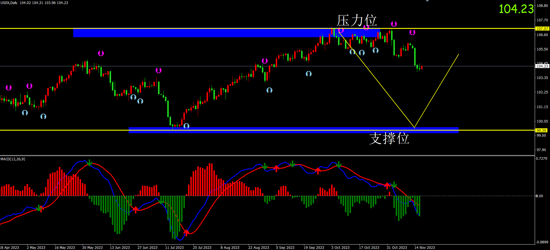美元指数:图表显示目前美指为震荡反弹行情。关注压力107.00位置。