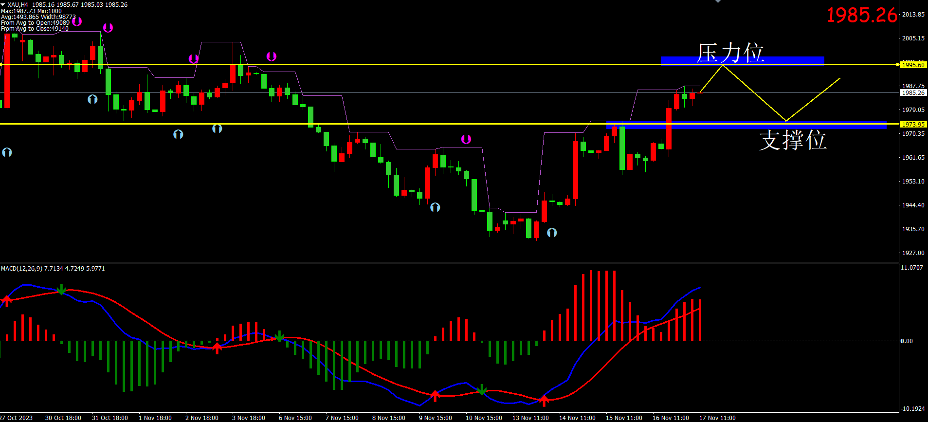 黄金技术指标avg显示目前K线在下轨附近运行,小时图周期为行情价格盘整,下方支撑1973.0附近(下轨),上方压力1995附近。MACD图形呈现均线相交箭头向上,目前盘整为主要MACD亚盘方向。