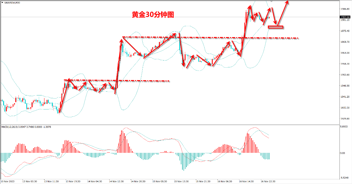 黄金昨日在小周期一片走强的情况下,突破大周期日线的布林中轨1975,然后打开上方空间,高点到达1987,从日K形态来看,黄金在1988/1990形成强压压制,若这波冲刺未破,将形成顶部。想布局中长线的朋友可以留意高点,分批布局。预计会试探刺破一下高点在下行,关注上周的高点1992.近两周的行情比较大,上周一黄金从1992跌到上周五1930,本周一黄金从1930上涨到1987,大家交易上轻仓介入。日内1975压力转换为支撑,建议回调到1976一线做多,止损1970,目标1983;上方1988/1990做空,止损1996,目标1978.(策略供参考)