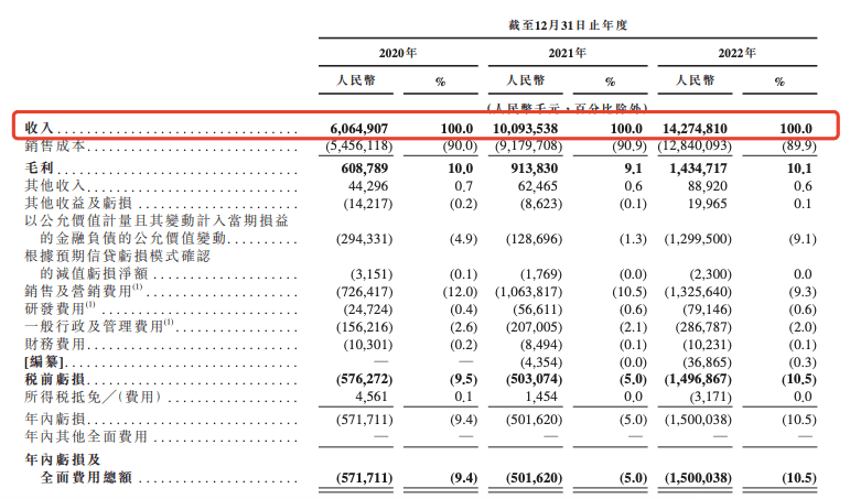数据显示,公司的总收入由2020年的人民币60.6亿元增加66.5%至2021年的人民币100.9亿元,并由2021年的人民币100.9亿元进一步增加41.4%至2022年的人民币142.7亿元。