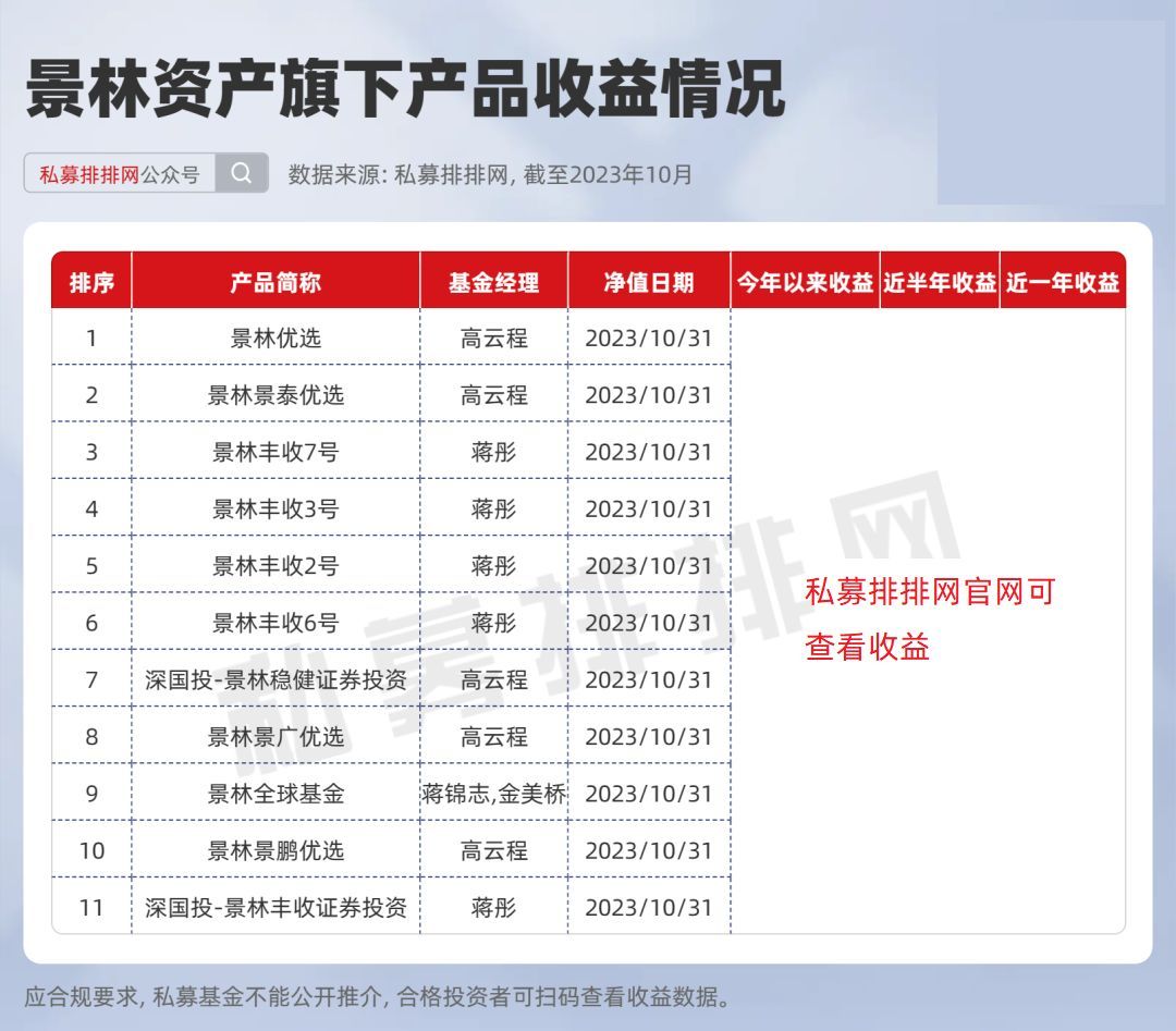 以下是景林资产旗下有业绩显示的11只产品近半年、今年以来以及近一年的收益情况: