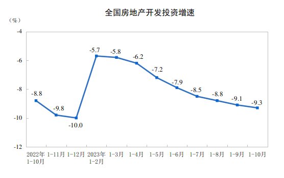 11月15日,国家统计局发布2023年1—10月份全国房地产市场基本情况。数据显示,1—10月份,全国房地产开发投资95922亿元,同比下降9.3%;其中,住宅投资72799亿元,下降8.8%。