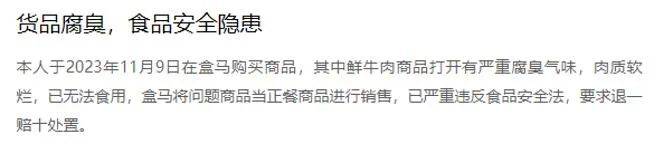 “财经武林门”注意到,黑猫投诉上,关于盒马的投诉多达7500余条,主要涉及食品安全、质量问题等。有投诉者称:“本人于2023年11月9日在盒马购买商品,其中鲜牛肉商品打开有严重腐臭气味,肉质软烂,已无法食用,盒马将问题商品当正餐商品进行销售,已严重违反食品安全法,要求退一赔十处置。”