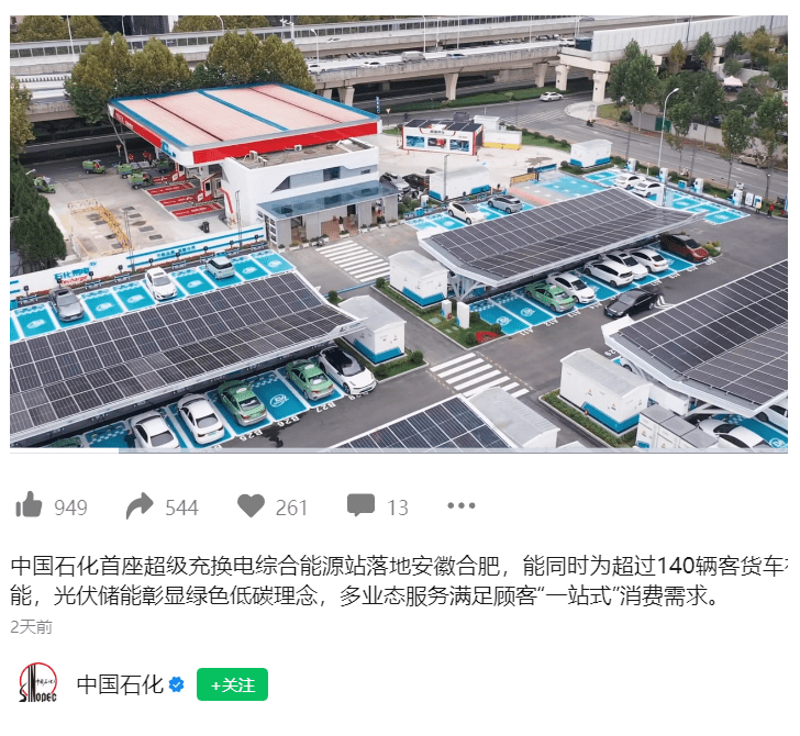 IT之家 11 月 17 日消息,中国石化宣布,11 月 17 日,中国石化首座超级充换电综合能源站 —— 安徽石油大众综合能源站在合肥投入运营。