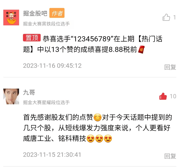 为鼓励大家交流互动,进一步打开投资视野,掘金股吧的热门话题从11月5日开始推出参与评论点赞赢取现金奖励的活动。掘金股吧发布热门话题的时间是从周日晚到周四晚,发布时间一般在晚上6点到8点左右。大家在热门话题下方评论点赞,从发布之时起到次日的晚上9点,对评论点赞数最高的粉丝奖励8.8元(税前)。