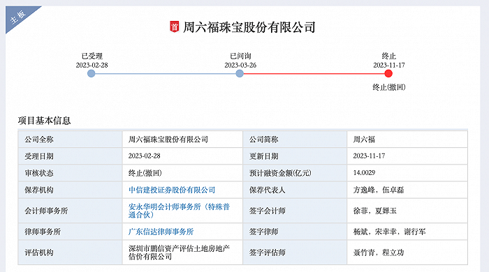 11月17日,深交所公告,11月8日,周六福珠宝股份有限公司向本所提交了《周六福珠宝股份有限公司关于撤回首次公开发行股票并在主板上市申请文件的申请》,保荐人向本所提交了《中信建投证券股份有限公司关于撤回周六福珠宝股份有限公司首次公开发行股票并在主板上市申请文件的申请》。深交所决定终止对该公司首次公开发行股票并在主板上市审核。