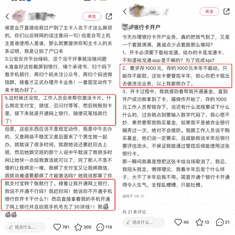 记者发现,在社交平台上,许多网友晒出了自己开卡过程中的遭遇,有的网友感叹“五花八门的要求越来越多”。这些要求究竟是办卡新规,还是另有玄机?
