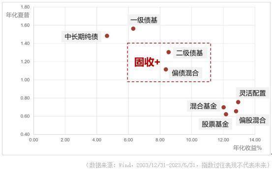把年化收益和年化夏普比率放到下图中,更能直观感受到:“固收+”产品的年化收益、年化夏普比率均处于适中水平,可以说是既能避免大幅波动、又能力求长期可观回报,“性价比”较高的一类选择。
