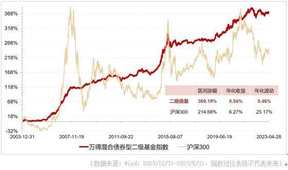 以二级债基为例,尽管只有20%的仓位可投股票,但得益于固收资产的“压舱石”作用,以及股债分散化投资的效果,过去近二十年间,二级债基指数能够从容穿越周期,涨幅远超沪深300,年化收益、年化波动的表现也均优于沪深300。