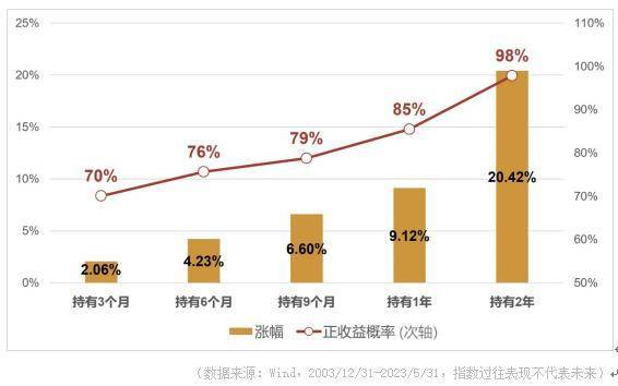 以二级债基指数为例,在指数基期以来的近20年间,计算任一时点开始持有一定期限,所获得的平均收益,以及正收益的概率。