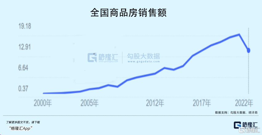 2021年,中国商品房销售额高达18.19万亿元,首次突破18万亿大关。当年销售面积17.94亿平方米。两项数据均双双创下历史新高。
