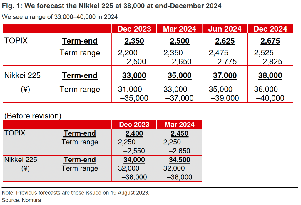 野村预计,日股2023财年每股收益(EPS)将同比增长13.3%;2024年增长3.5%;2025年增长11.8%,因而日经225指数将在2024年12月底将站上38000点。
